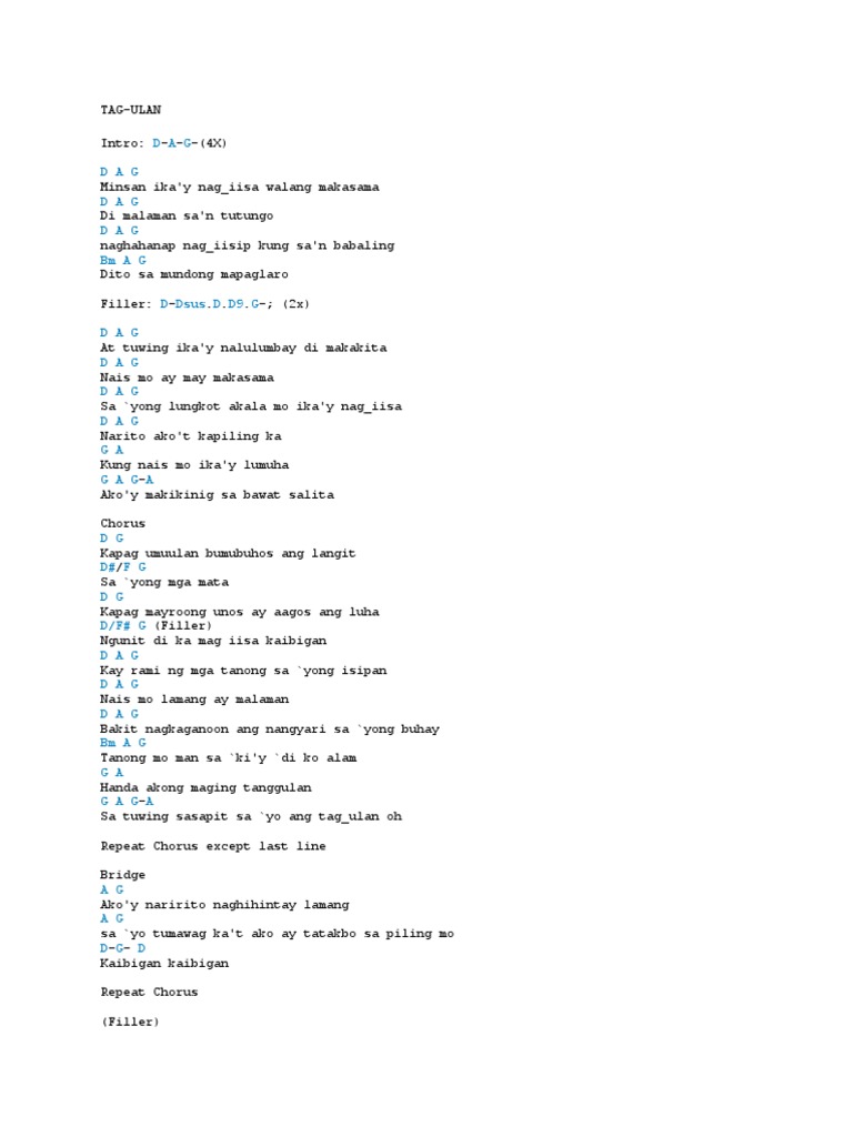Ayos lang hindi ka nag-i. G C Kapag umuulan bumubuhos ang langit G C Sa yong mga mata G C Kapag mayrong unos ay aagos ang luha G C Ngunit di ka nag-iisa Bridge. Nais mo lamang ay malaman.