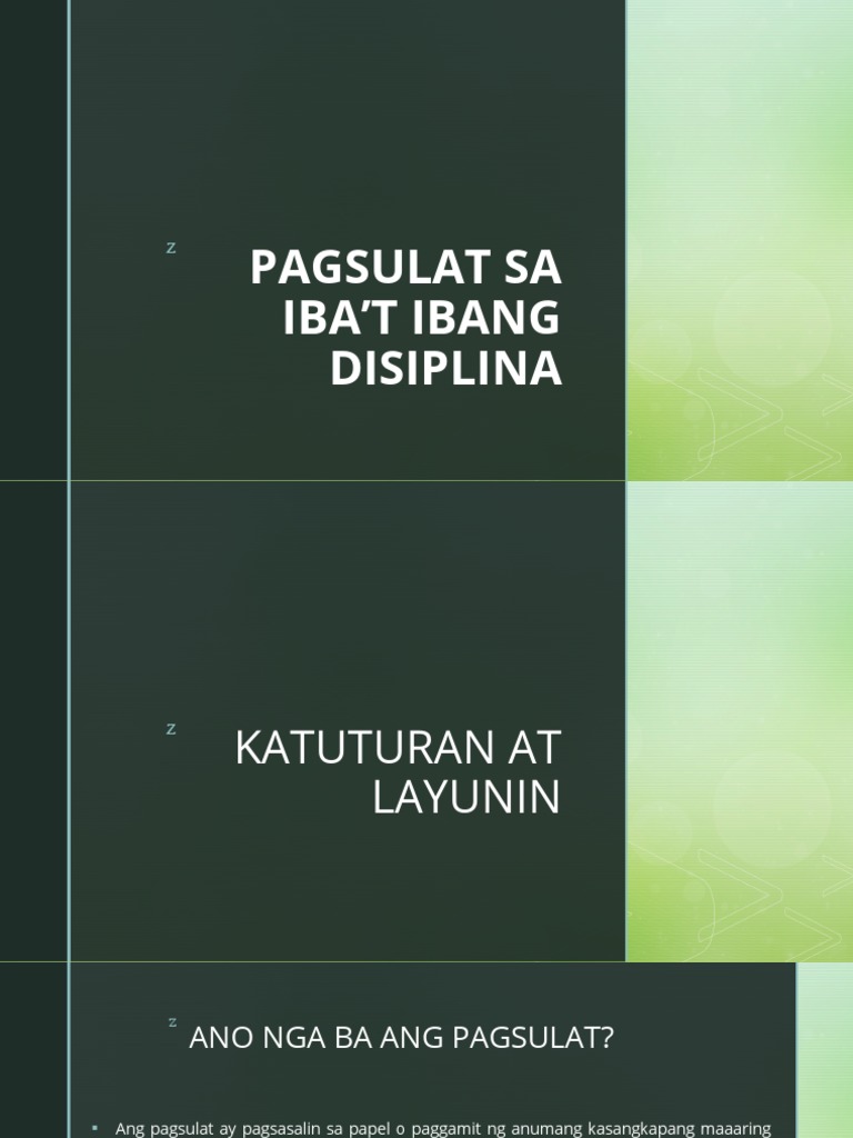 Ang pagsulat ay obhentibo at hindi personal o pansarili. Ang akademikong sulatin ay nakaugnay sa akademikong disiplina na hindi pinaghihiwalay ang kognisyon at pagsulat at makikilala mo ang isang sulatin kung akademiko ito o hindi dahil ang akademikong sulatin ay makikilala sa layuninkatangian at anyo nito. Ang pagsulat ay pagsasalin sa papel o paggamit ng anumang kasangkapang maaaring magamit na mapagsasalinan. Ang kakayahan sa pagsulat nang mabisa ay isang bagay na totoong mailap para sa nakararami sa atin maging itoy pagsulat sa una o.