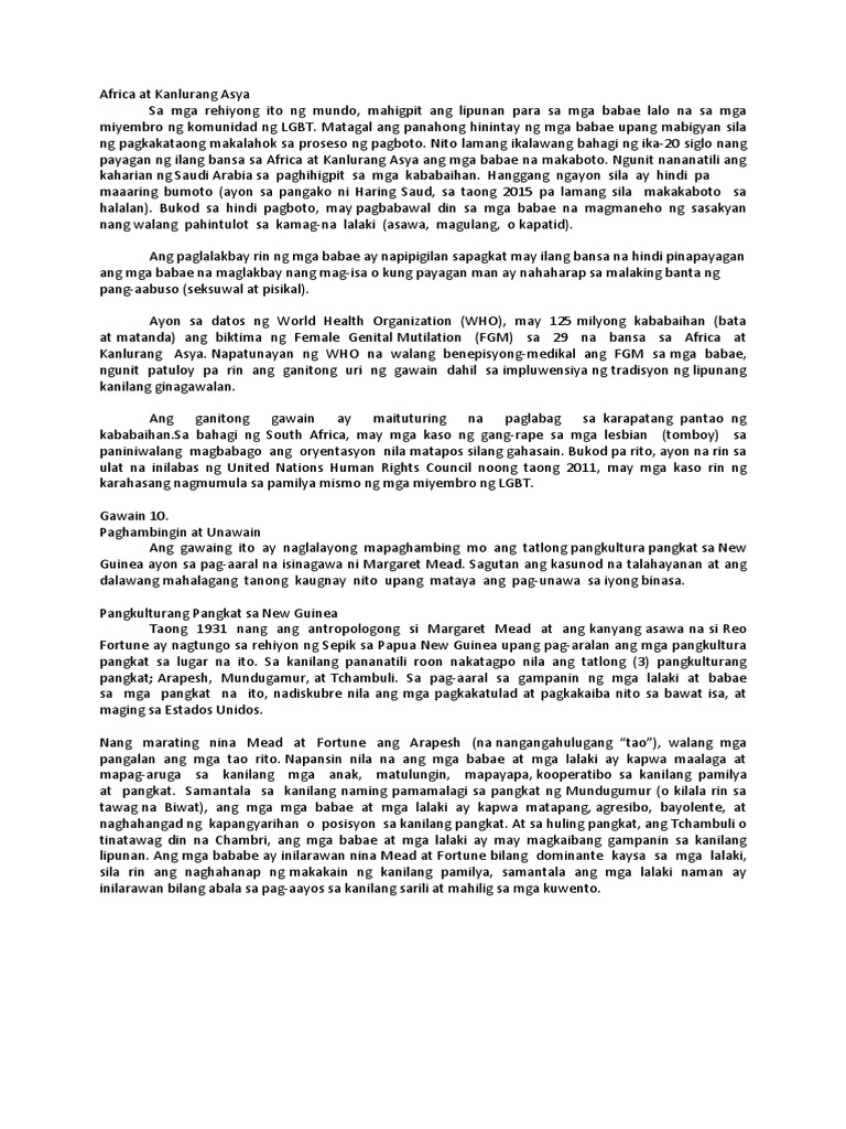 13012019 Nito lamang ikalawang bahagi ng ika-20 siglo nang payagan ng ilang bansa sa Africa at Kanlurang Asya ang mga babae na makaboto. Ito ay tinukoy ng World Health Organization bilang panlipunang gawain kilos at gawain na itinakda ng lipunan para sa mga babae at. Nito lamang ikalawang bahagi ng ika-20 siglo nang payagan ng ilang bansa sa Africa at Kanlurang Asya ang mga babae na makaboto.